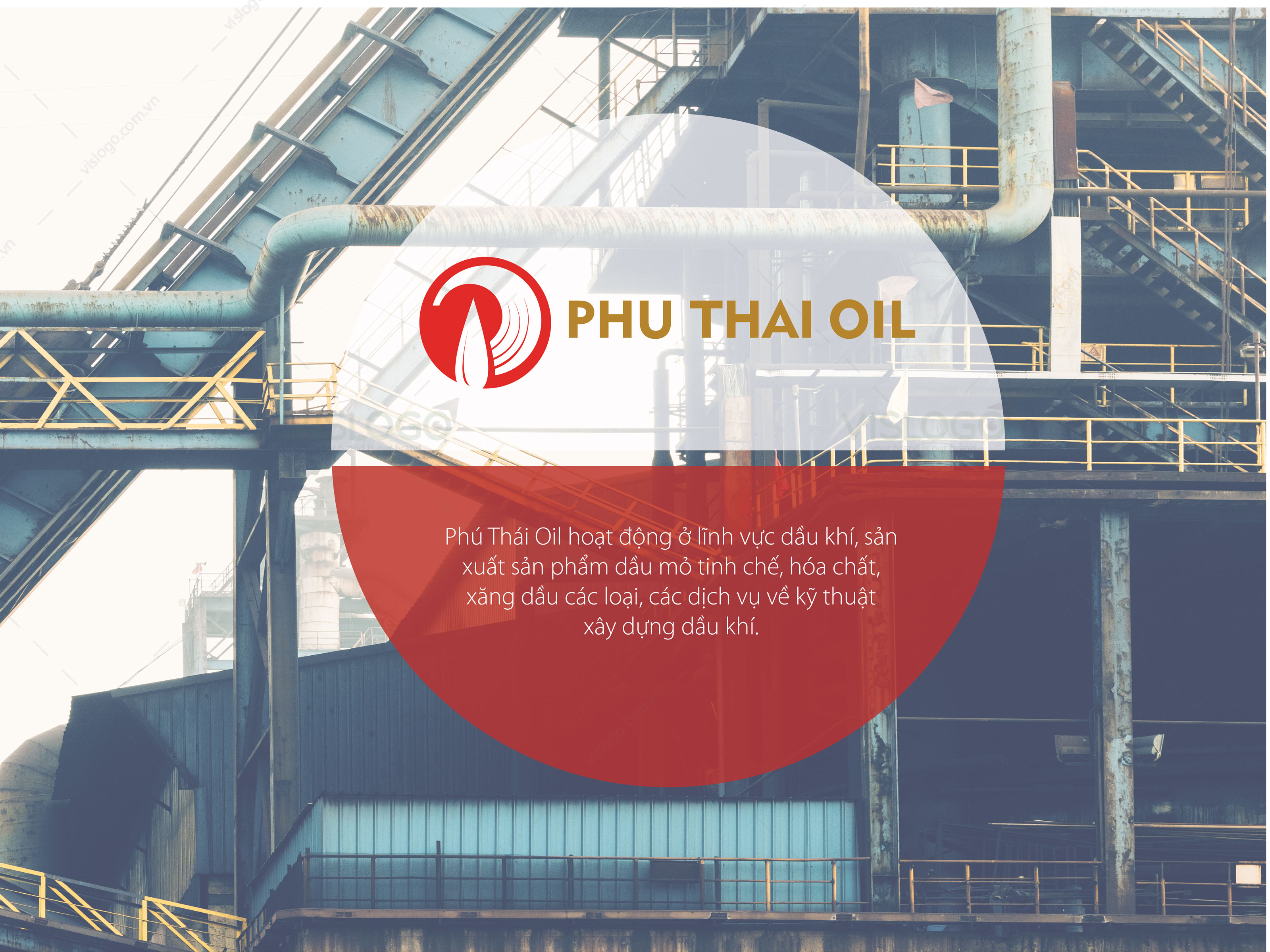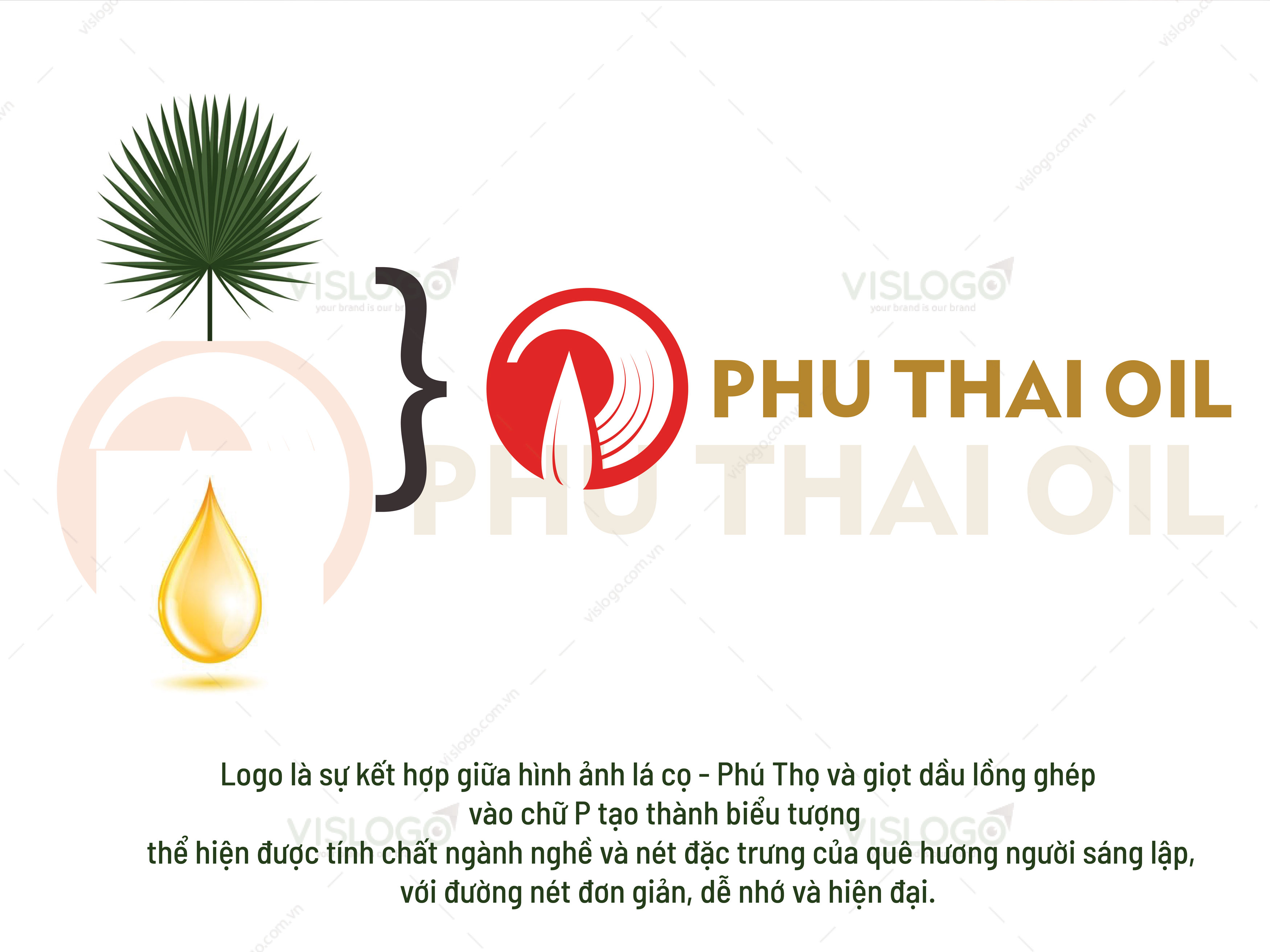 Phú Thái Oil hoạt động ở lĩnh vực dầu khí, sản xuất sản phẩm dầu mỏ tinh chế, hóa chất, xăng dầu các loại, các dịch vụ về kỹ thuật xây dựng dầu khí. Người sáng lập quê hương ở Phú Thọ, mong muốn đem hình ảnh của quê hương vào logo. Phú Thọ được mệnh danh là xứ cọ của miền Bắc, VISLOGO đã khai thác hình ảnh lá cọ + giọt dầu lồng vào chữ P chữ cái đầu của tên thương hiệu. Logo vừa thể hiện được lĩnh vực hoạt động vừa mang nét đặc trưng quê hương nhưng vẫn đảm bảo tính hiện đại.