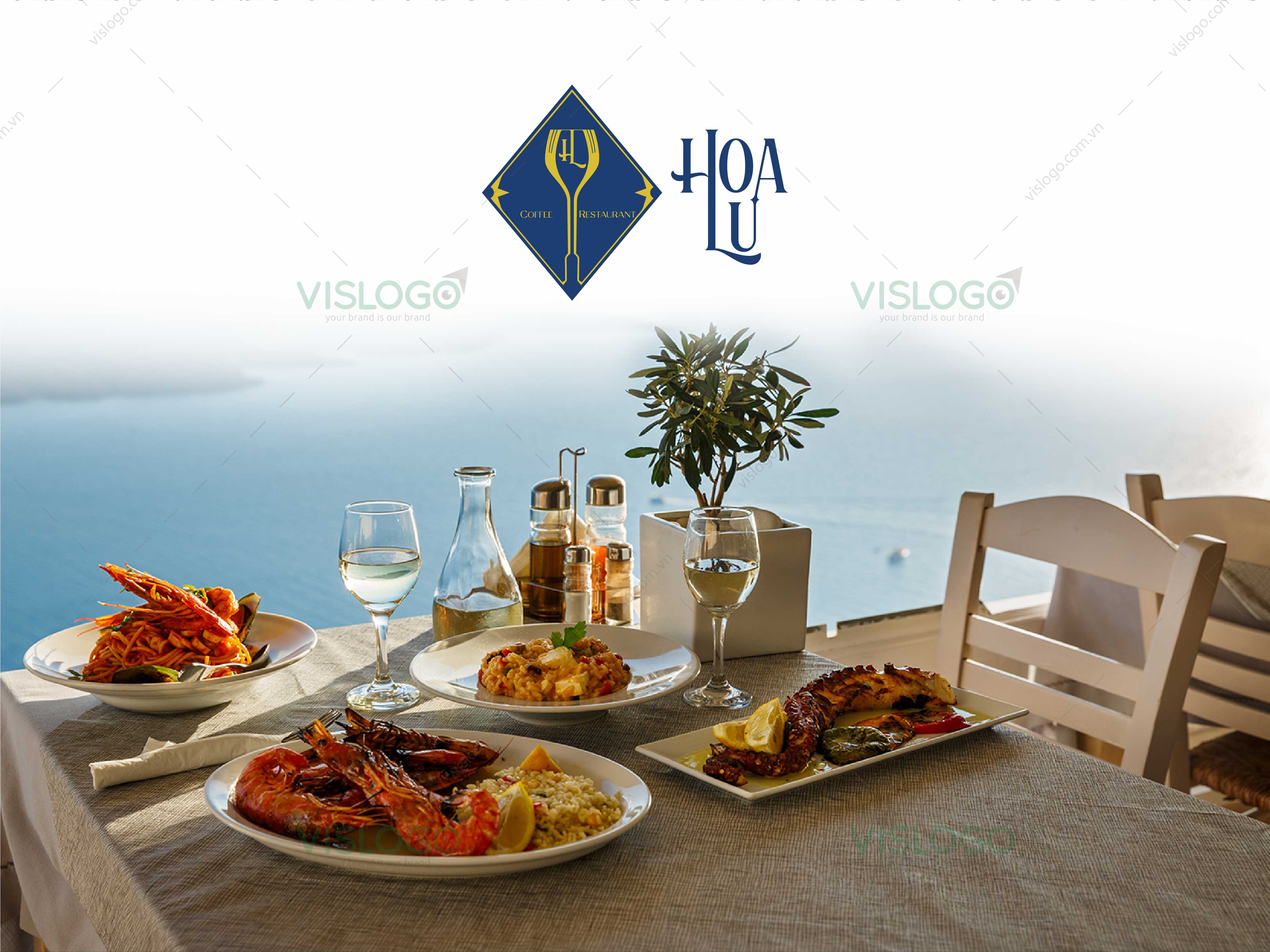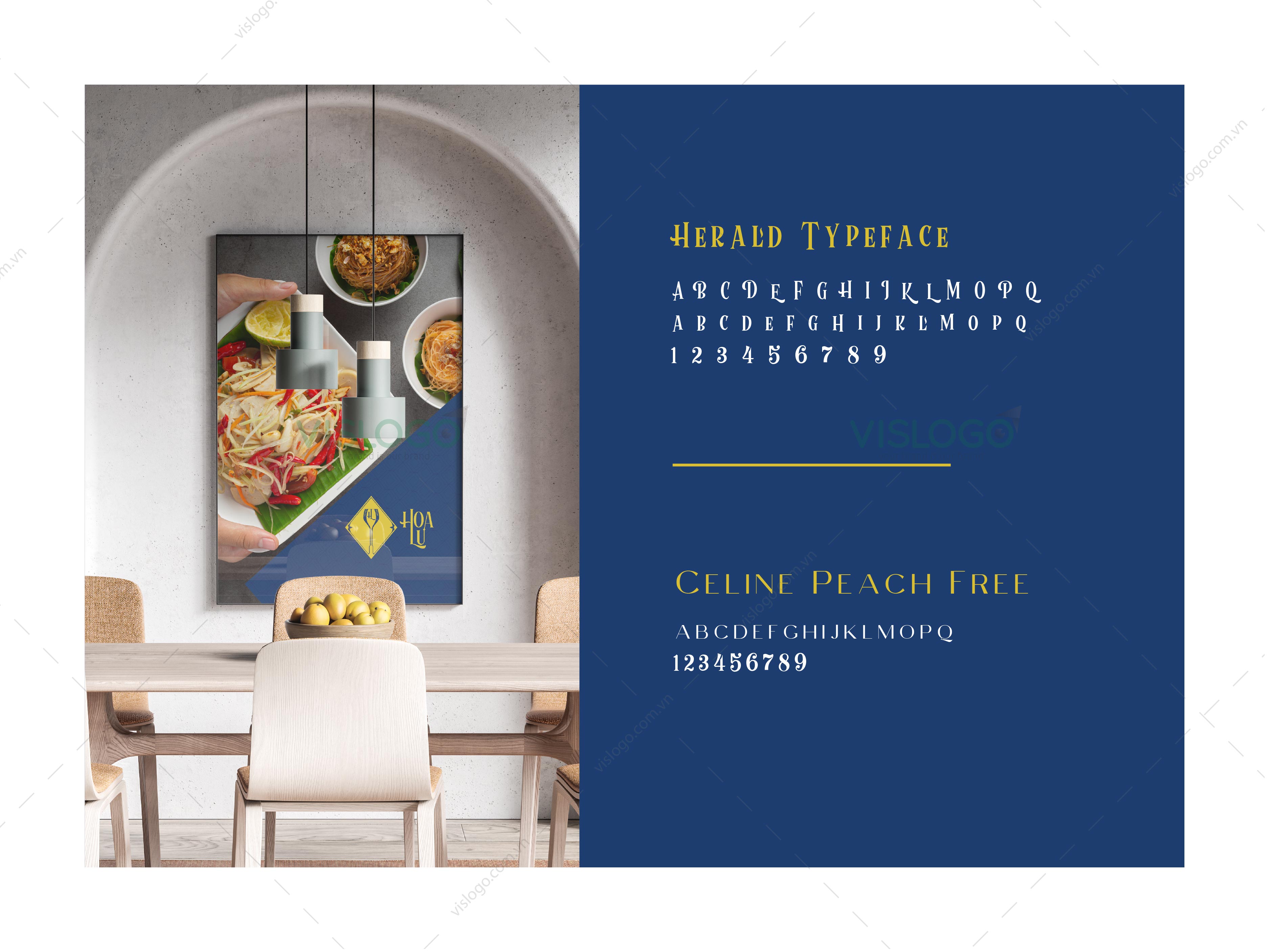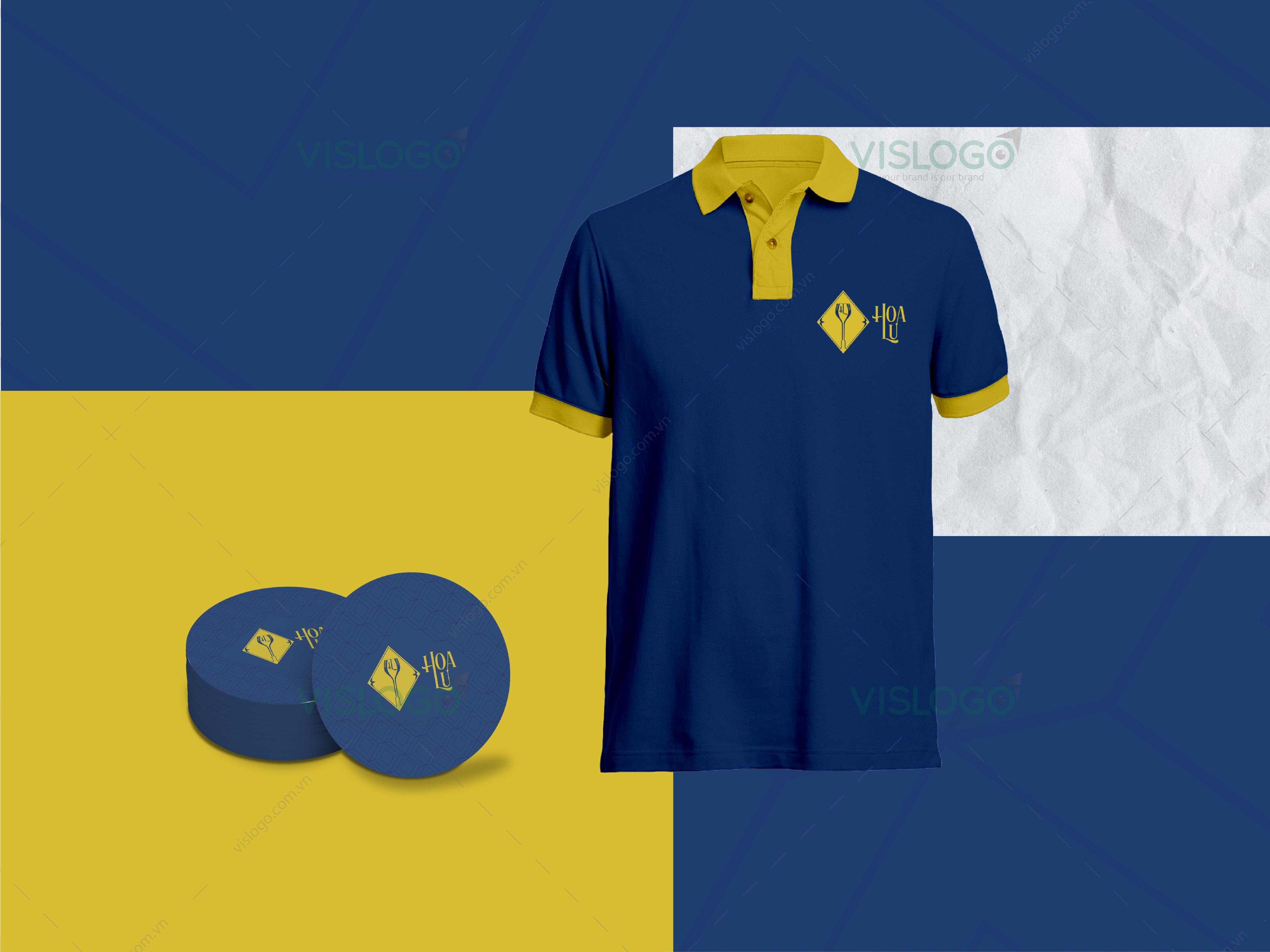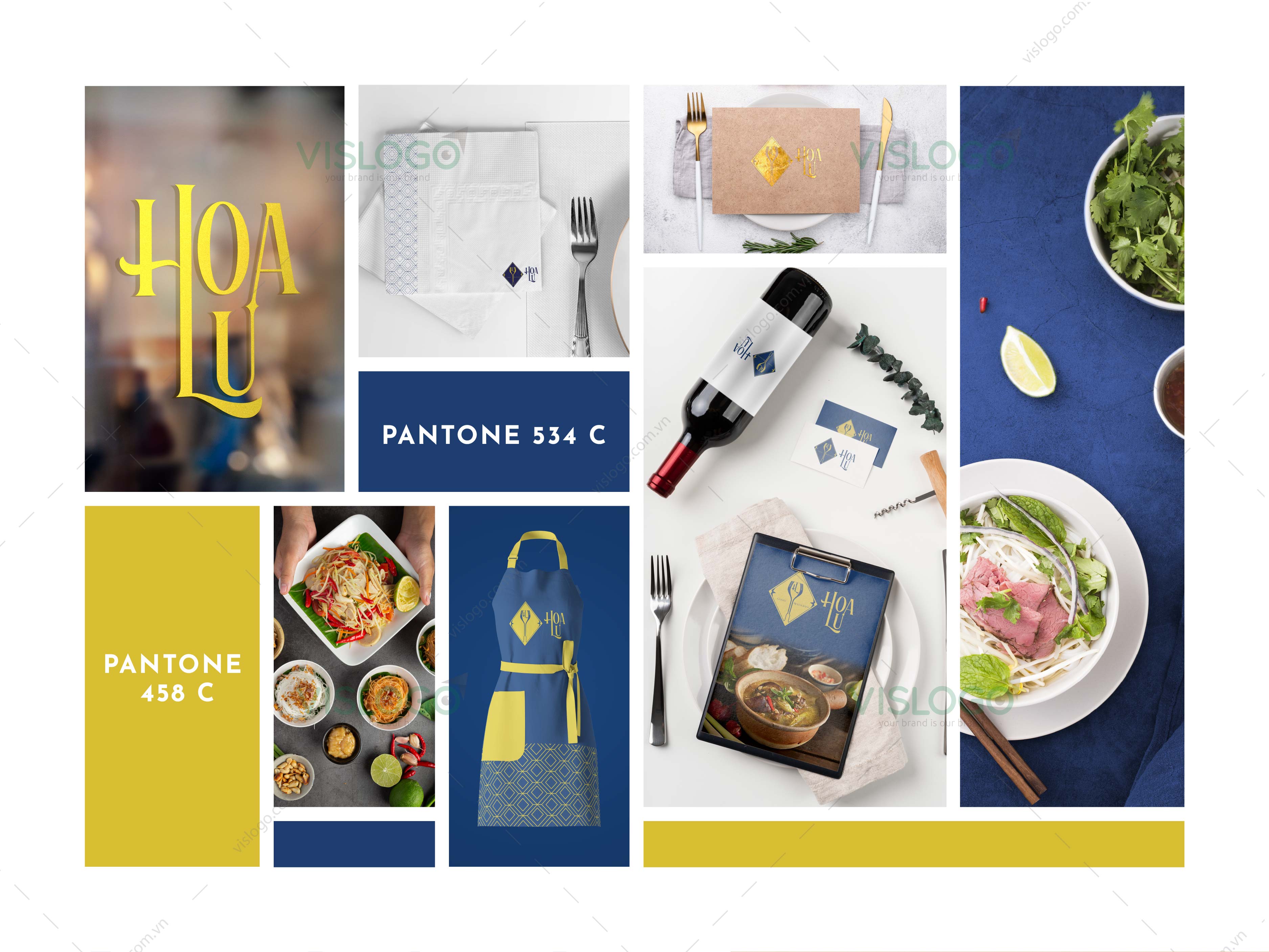 Màu vàng bổ trợ cho màu xanh, tạo nên nét nổi bật cho logo. Màu sắc hài hòa trang trọng phù hợp với không gian nhà hàng.