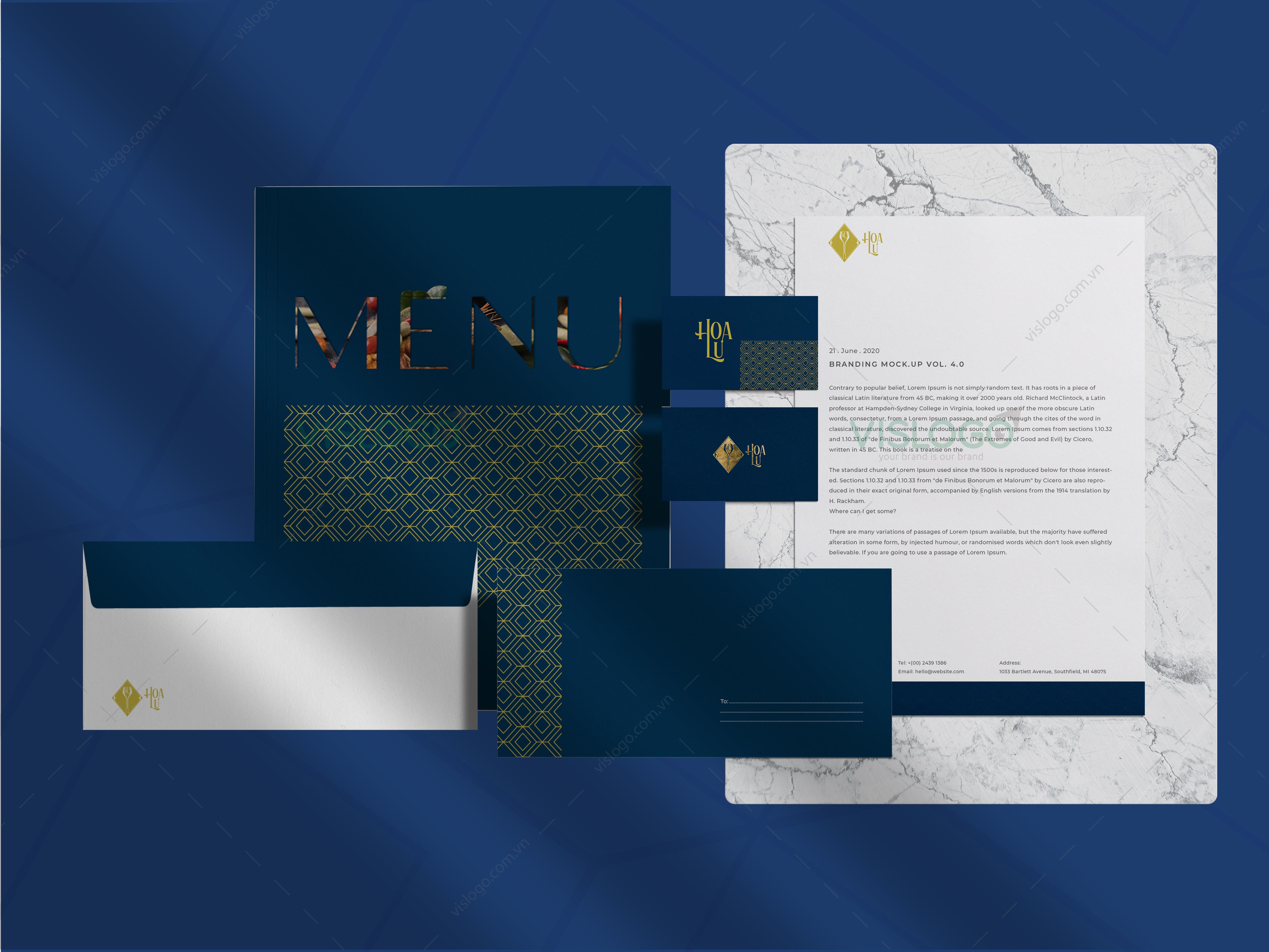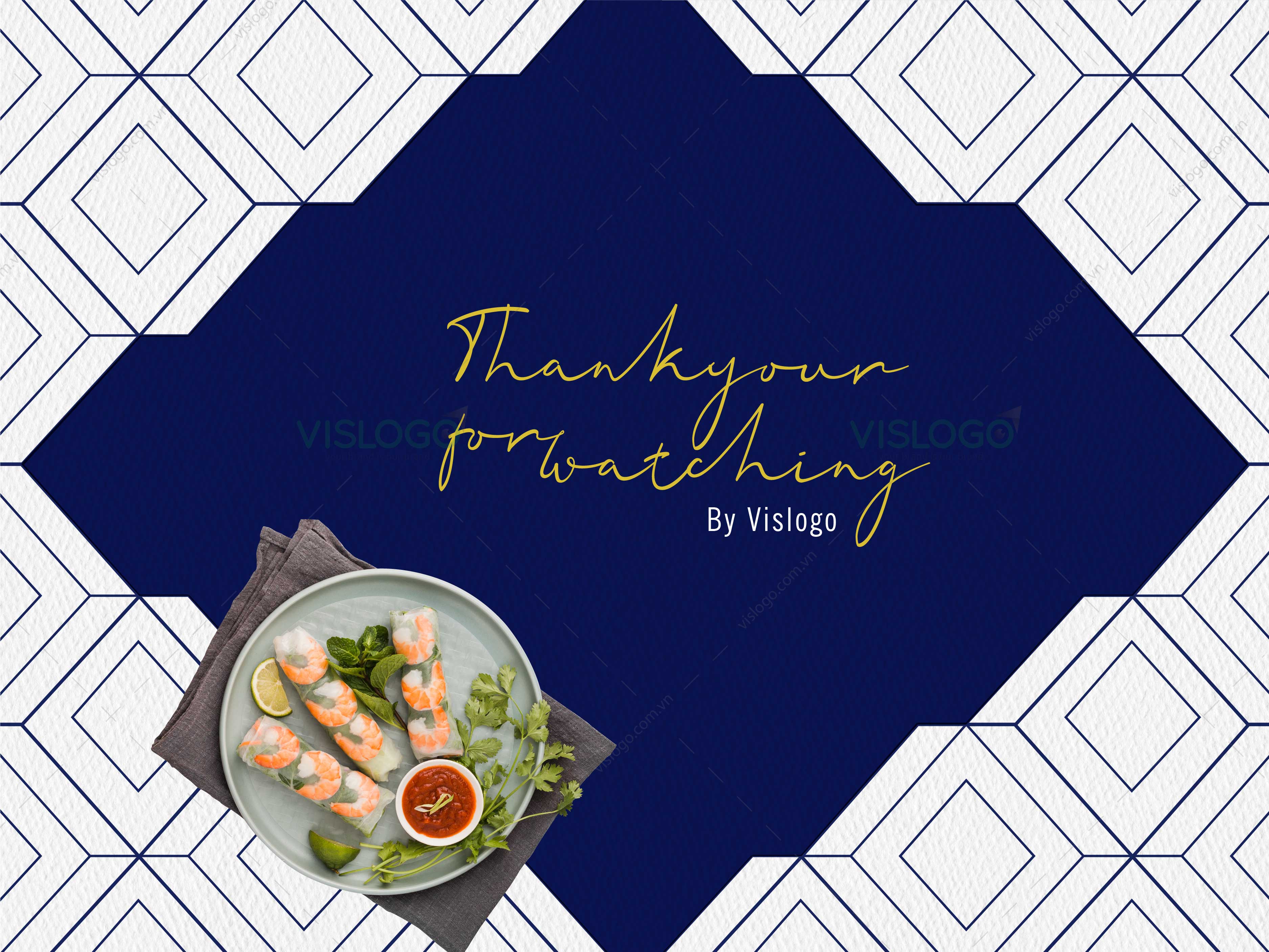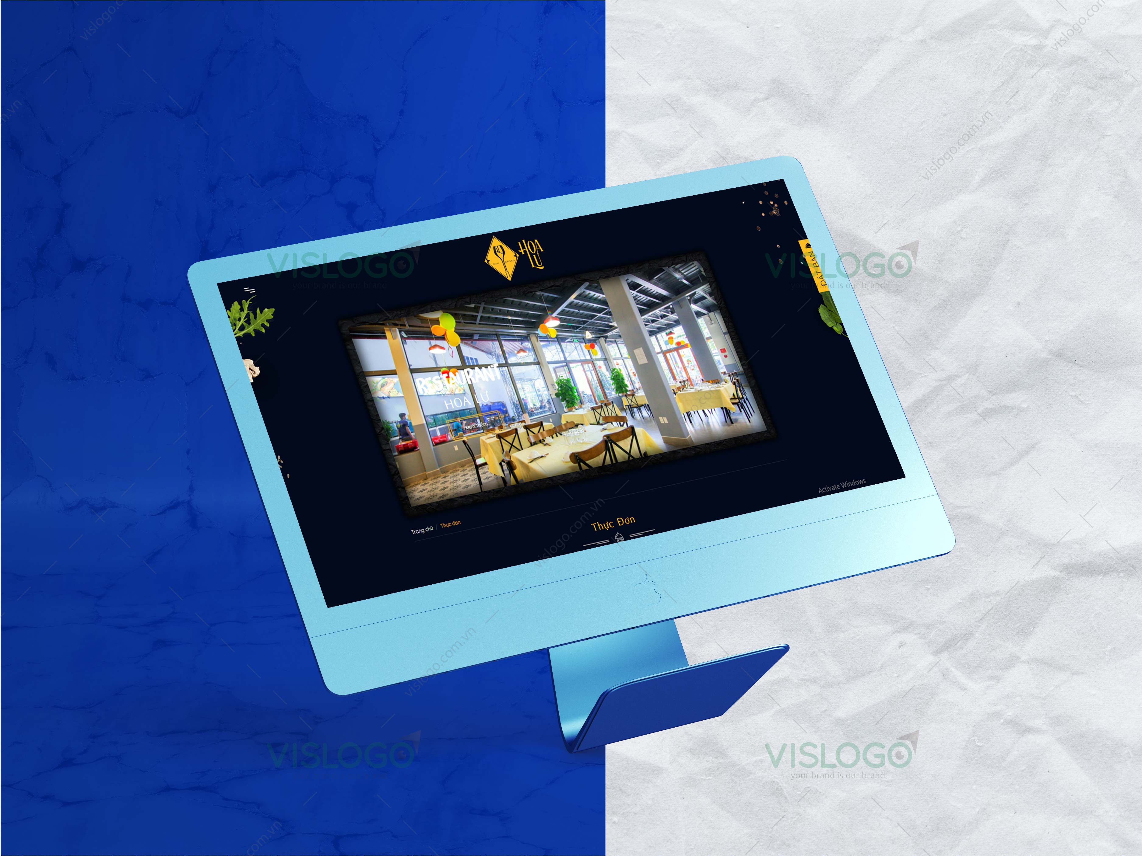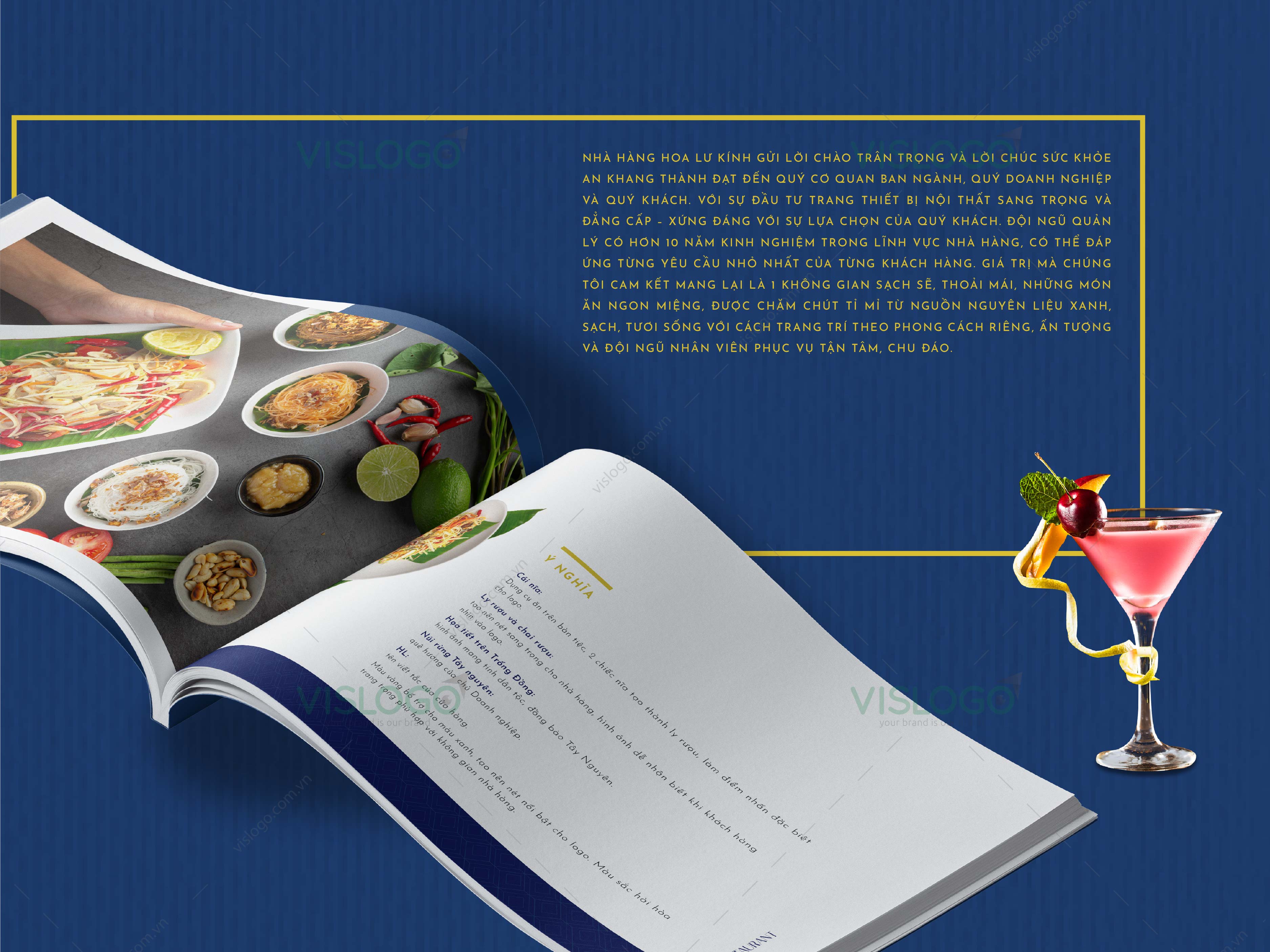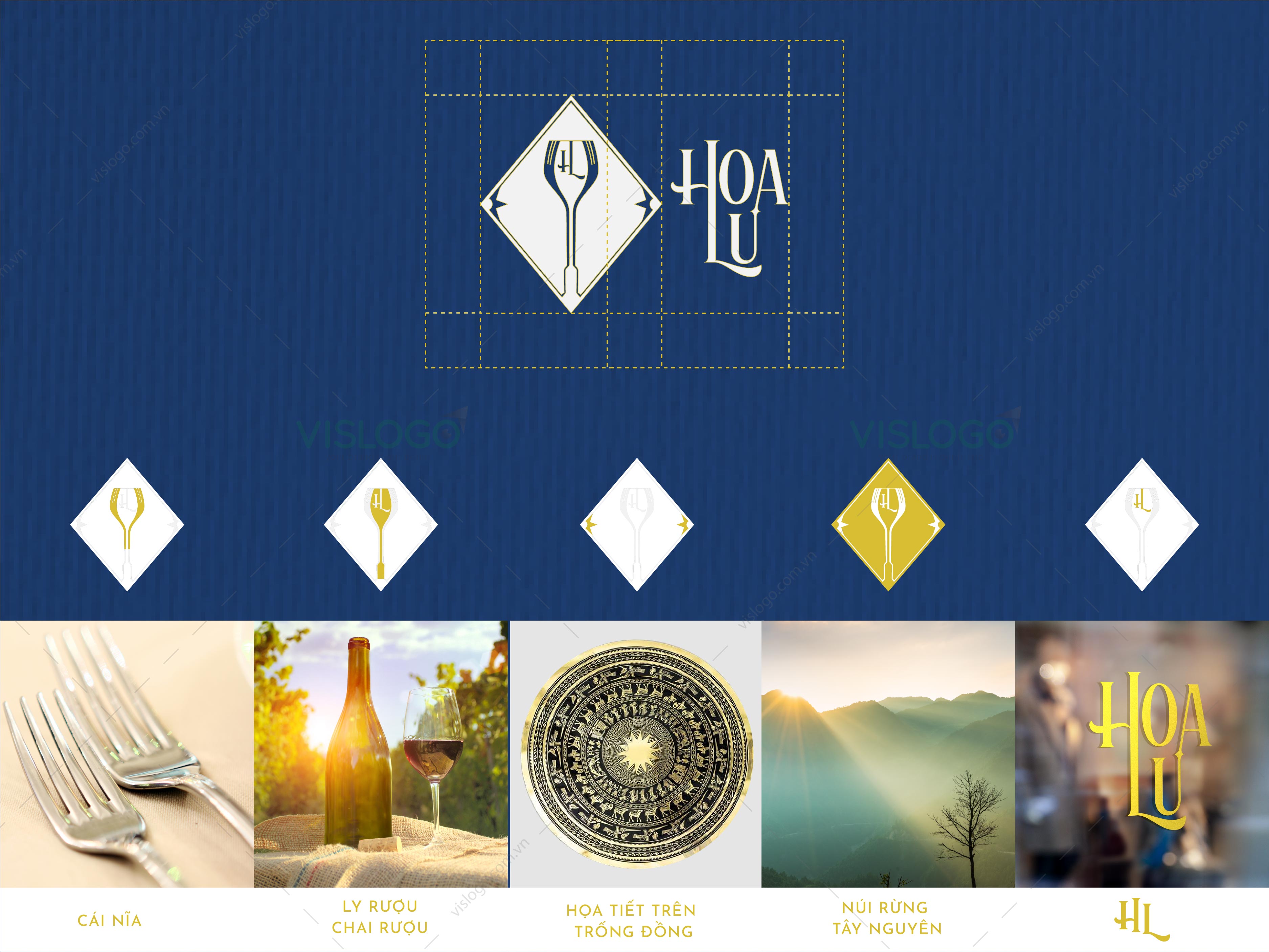 Màu vàng bổ trợ cho màu xanh, tạo nên nét nổi bật cho logo. Màu sắc hài hòa trang trọng phù hợp với không gian nhà hàng.