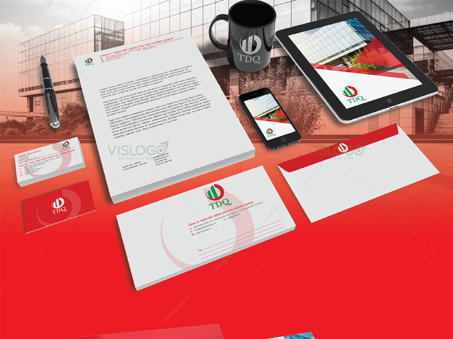 Logo được cách điệu từ hình ảnh chữ cái đầu T-D-Q + hình ảnh tòa nhà thể hiện cho lĩnh vực hoạt động của thương hiệu, màu sắc theo phong thủy của chủ doanh nghiệp